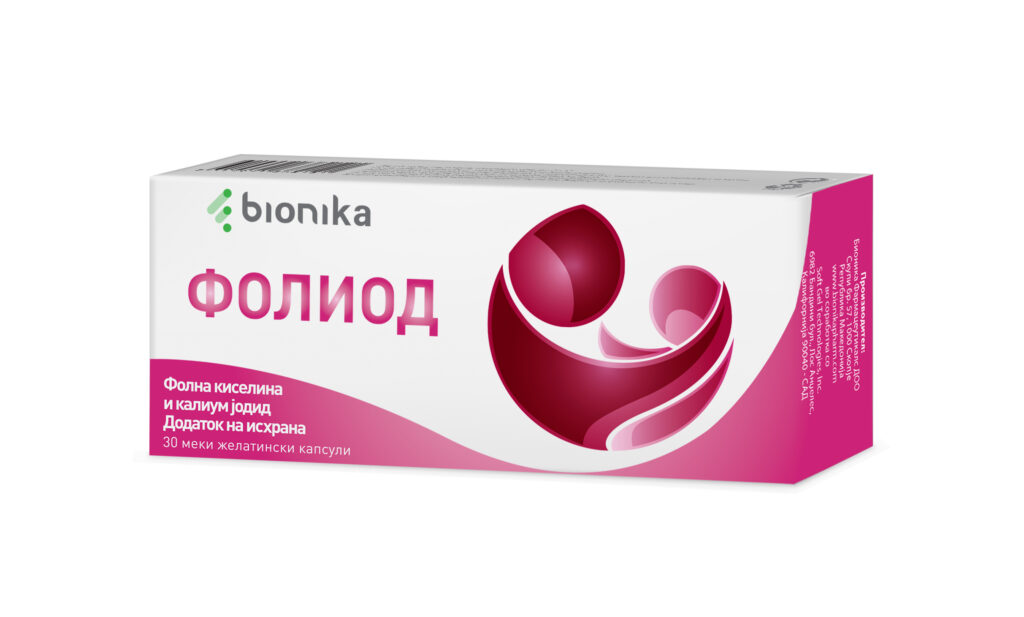 Food supplement during pregnancy and lactation 30 gelatin capsules, soft Necessary combination of folic acid and potassium iodide : 400 μg folic acid 100 μg potassium iodide Folic acid and iodine are the most important substances which should be supplemented throughout pregnancy and lactation. Requirements for iodine and folic acid during pregnancy and lactation increase twice and usually are not completely satisfied only with food intake. By using FOLIOD capsules, even before the pregnancy, during the pregnancy and breastfeeding provides optimal satisfying of increased requirements for iodine and folic acid and helps normal development of psychological, neurological and cognitive functions of the fetus.